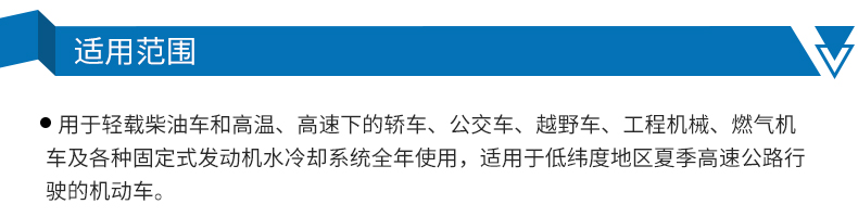 ●用于輕載柴油車和高溫、高速下的轎車、公交車、越野車、工程機械、燃氣機車及各種固定式發(fā)動機水冷卻系統(tǒng)全年使用。適用于低緯度地區(qū)夏季高速公路行的機動車。